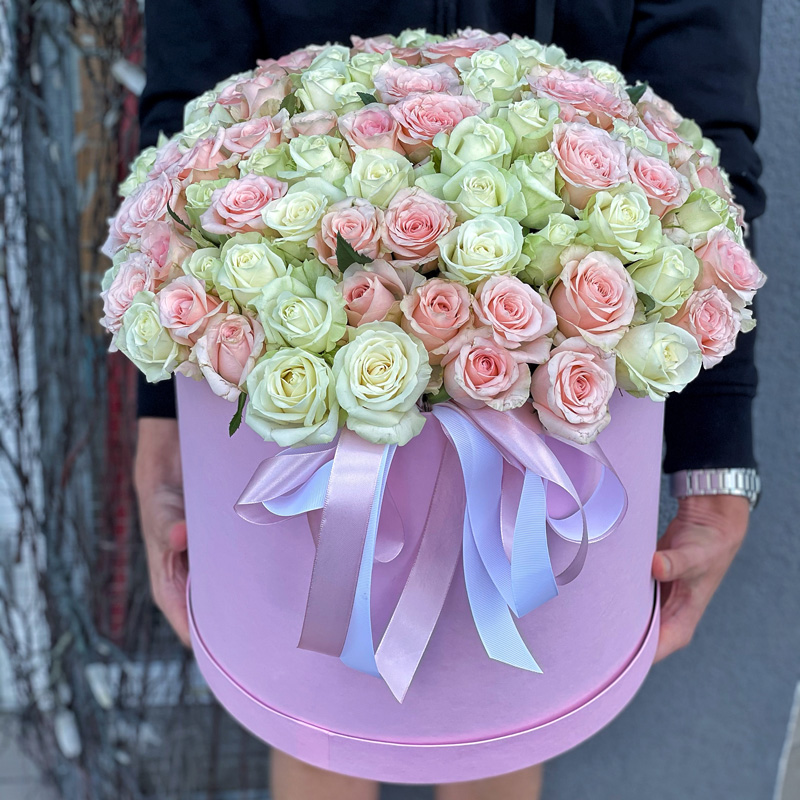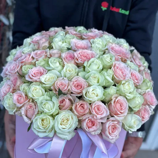 Не відкладайте! Замовте 101 троянду мікс біло-рожеву в капелюшній коробці вже сьогодні, щоб подарувати емоції, які залишаться у серці надовго.