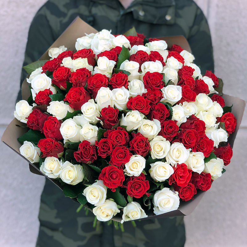 Букет 101 троянда мікс червоно-біла 50 см — це вишукане поєднання пристрасті та ніжності, втілене у кожній квітці. Контраст червоних і білих троянд створює неповторну гармонію, яка ідеально підходить для особливих моментів: річниць, освідчення, весіль або подарунків з нагоди великих досягнень.