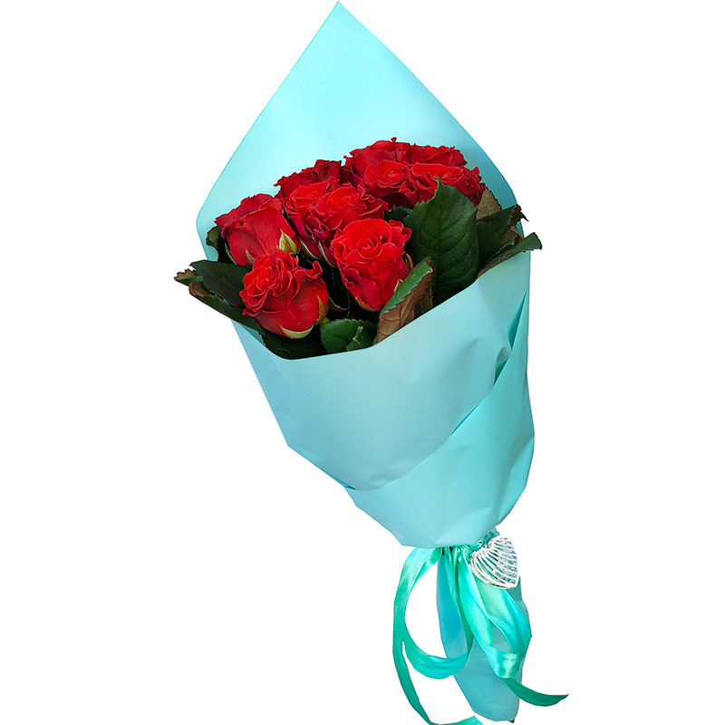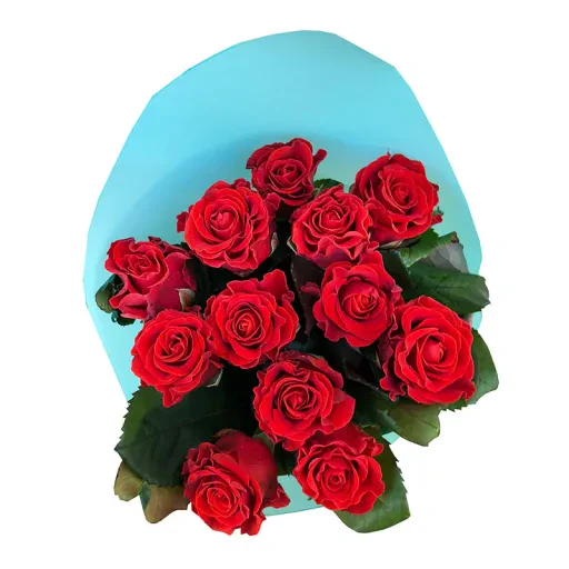 Букет складається з 11 троянд висотою 50 см, загорнутих у стильний дизайнерський папір ніжно-блакитного кольору, що додає композиції сучасності та витонченості. Така композиція ідеально підходить для святкування дня народження, річниці або просто як знак уваги близькій людині.