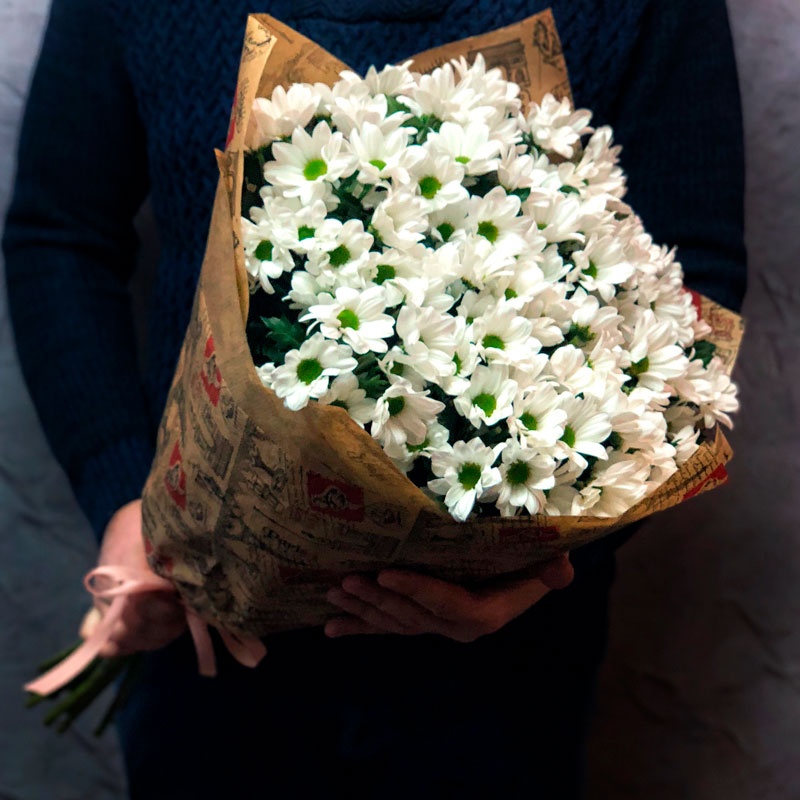 Цей букет зібраний з 15 хризантем білого кольору і відрізняється від попереднього лише своєю упаковкою. Вона міцніша і приємна на вигляд. Нагадуємо, що у нас Ви маєте можливість оформити доставку хризантем по Києву цілодобово. Наші кур'єри здійснюють доставку букетів зі складу безпосередньо до клієнтів, що гарантує виняткову свіжість квітів. Рекомендуємо Вам прочитати статтю про подарунки на 8 березня. (хризантема, хризантеми)