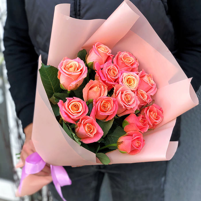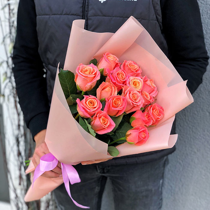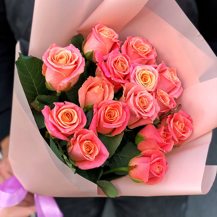 Невеликий букет з 15 помаранчевих троянд Міс Піггі стане лаконічним подарунком для будь-якого приводу. Ці квіти відрізняються своїм унікальним рожево-кораловим відтінком, завдяки якому вони і отримали таку назву. Широкі повітряні суцвіття мають ледве помітним ароматом і зберігають свіжість і чудовий вид на протязі довгого часу.