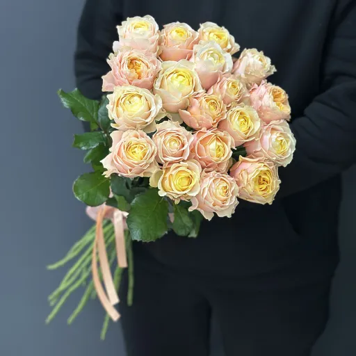 Букет 19 піоноподібних троянд Peter’s Park – це гармонія вишуканості, ніжності та вражаючого стилю. М’які кремові та абрикосові відтінки цих троянд створюють особливу атмосферу тепла і гармонії, роблячи цей букет ідеальним подарунком для особливих подій.