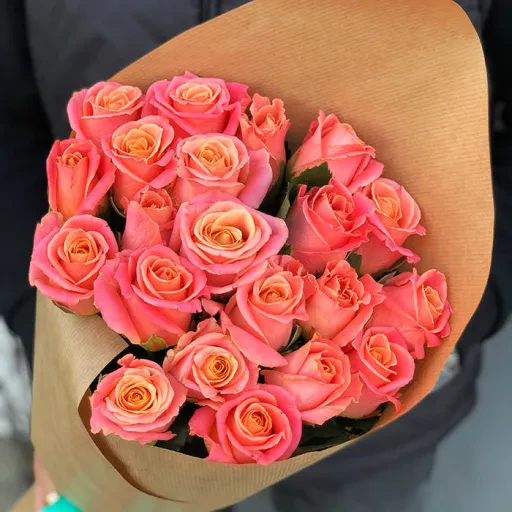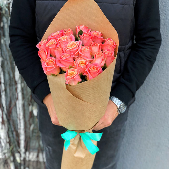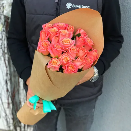 Дарувати радість рідним і близьким дуже просто - достатньо вибрати середнього розміру букет з 21 помаранчевої трояндою Міс Піггі висотою 60 см. Приголомшливо поєднання приємного рожево-персикового відтінку з лаконічною крафтового папером дозволяє створювати флористів ніжну композицію. Висота букета досягає 60 см, ширина - 25 см. Красиві квіти, вибрані для букета, завжди радують свіжістю. Такий монобукет з троянд обов'язково підніме настрій і принесе чимало приємних миттєвостей одержувачу!
