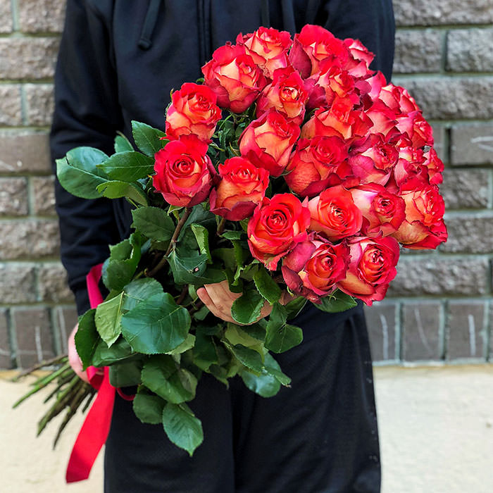 Дивовижна композиція з 25 помаранчевих еквадорських троянд Ігуазу - цілком самостійний презент висотою 80-90 см і шириною в 25 см. Неповторне змішання кольору - насичений червоний по краю і ніжний відтінок сердцевінкі - підкорить серце будь-якої дівчини. Доповнює таку красу ніжний приємний аромат. Квіти без обрамлення - лише з однієї лаконічної стрічкою - виглядають приголомшливо. Такий букет можна підносити за будь-що, щоб підняти настрій і підкорити серце!