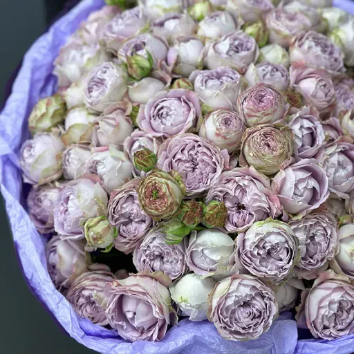 - 25 елегантних кущових троянд сорту "Блоссом Баблз" із унікальним бузковим кольором та ніжним ароматом.