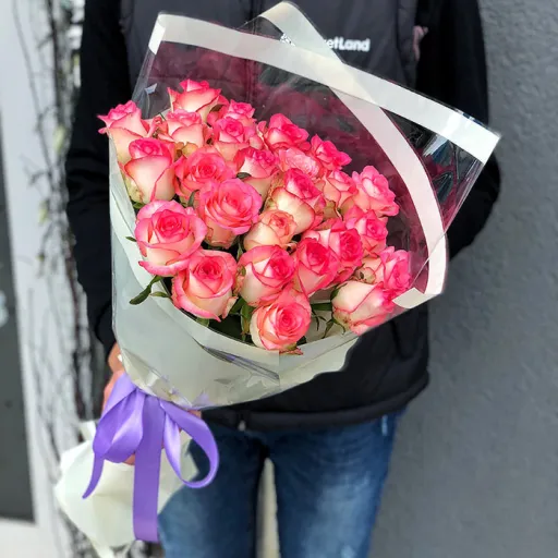 Букет 25 троянд Джумілія — це справжнє втілення вишуканості та свіжості. Невимушена комбінація рожевих і кремових відтінків троянд робить його унікальним вибором для особливих подій.