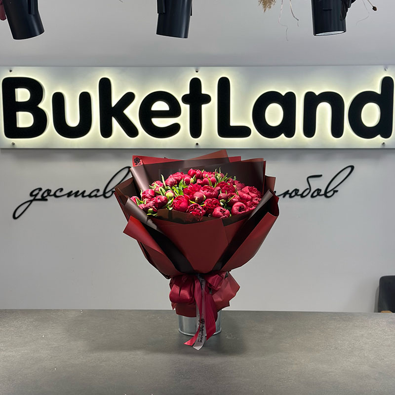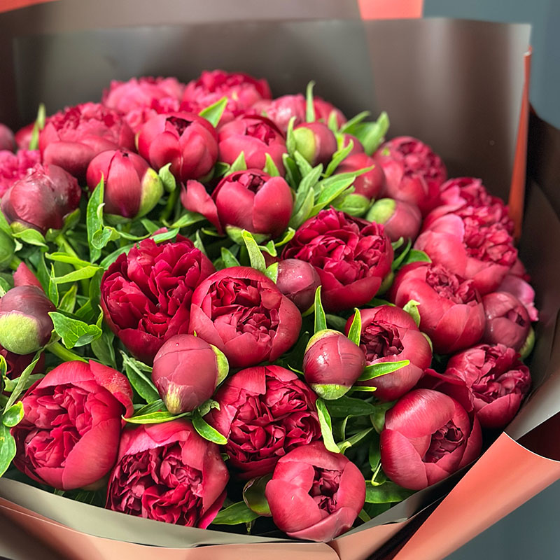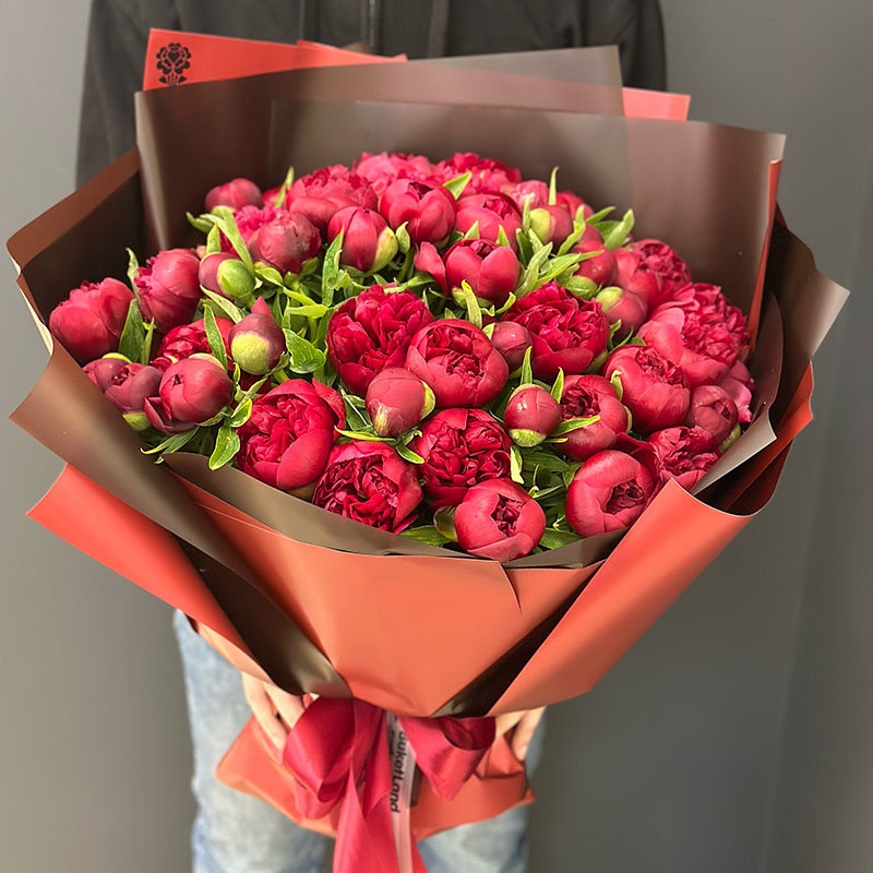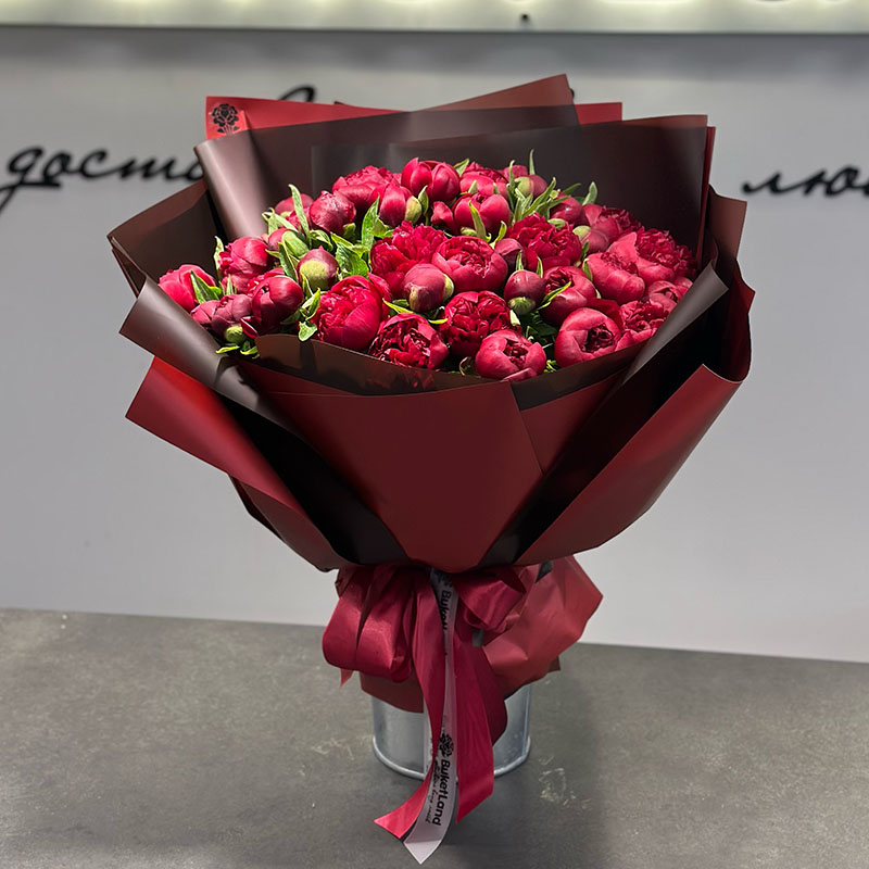 Букет із 51 голландського бордового півона — це справжній прояв розкоші та витонченості. Ці надзвичайні квіти сорту Kanzas зачаровують своїм насиченим бордовим кольором, який асоціюється зі шляхетністю, пристрастю та елегантністю.