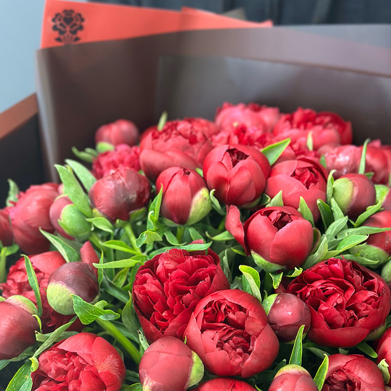 - Упаковка в червоних і коричневих тонах підкреслює глибокий колір півоній.