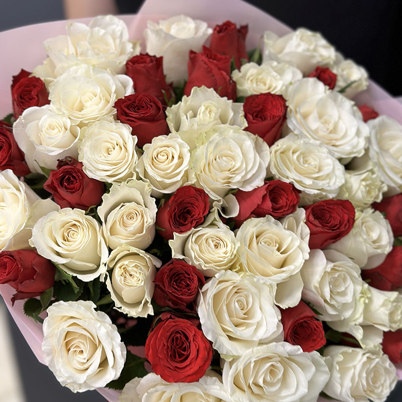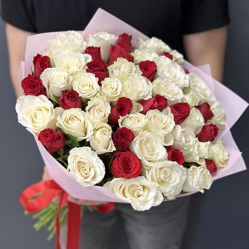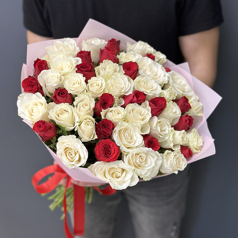Букет 51 червоно-біла імпортна троянда – це витончене поєднання червоних і білих троянд, які створюють гармонійну композицію, що вражає своєю красою. Червоні троянди символізують пристрасть і любов, а білі – чистоту та щирість. Така композиція стане ідеальним подарунком для святкування річниці, романтичного побачення чи навіть визнання у коханні.