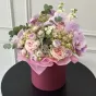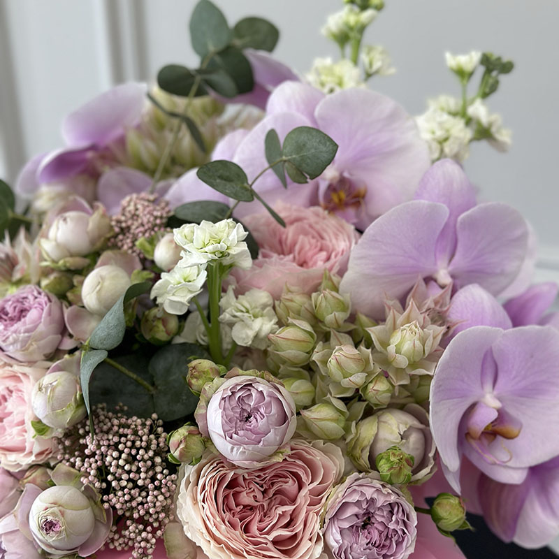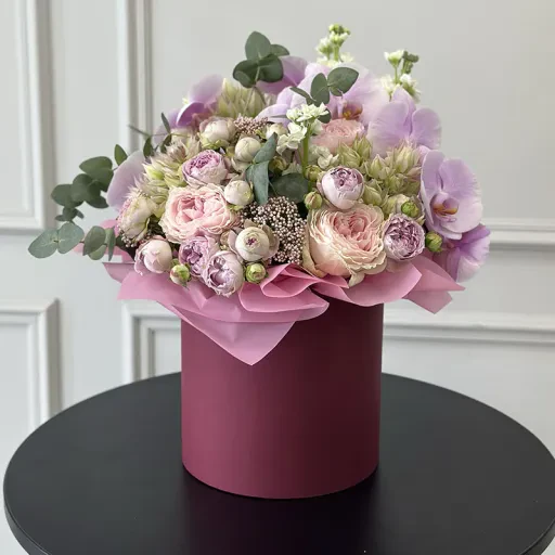 Ця композиція оформлена у стильній шляпній коробці 30×20 см, яка додає букету завершеності та робить його зручним для транспортування і зберігання.