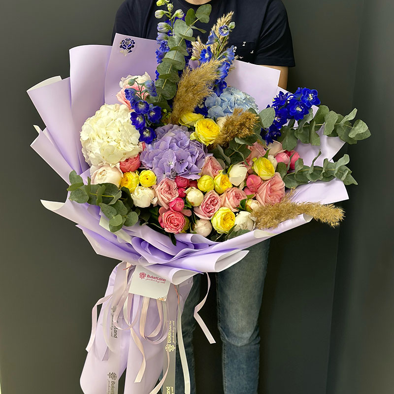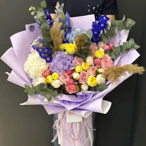 Авторський букет-гігант «Terry» – це розкішна квіткова композиція, яка поєднує в собі витончену естетику та символічну глибину. До складу букета входять ніжні гортензії, яскраві сині дельфініуми, кремові та рожеві троянди, пишні хризантеми, декоративний евкаліпт і стильні сухоцвіти, які додають унікальності.