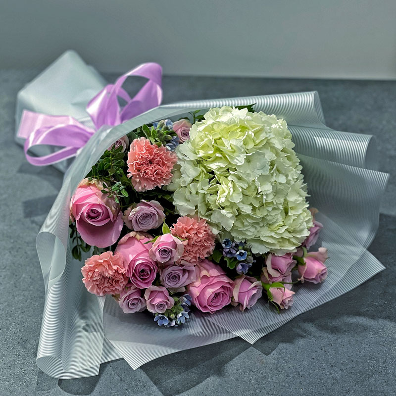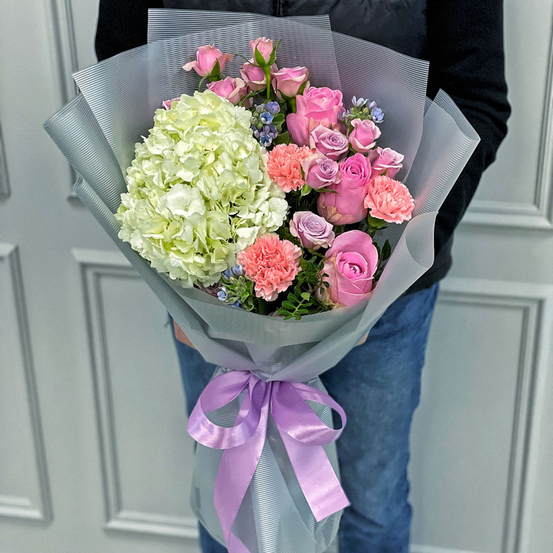 Цей букет ідеально підходить для привітання з днем народження, річницею, заручинами чи як подарунок колезі або другу. Гортензія уособлює подяку та гармонію, а піоноподібні троянди додають романтики. Композиція має делікатний і стильний вигляд, підкреслюючи смак і турботу дарувальника.