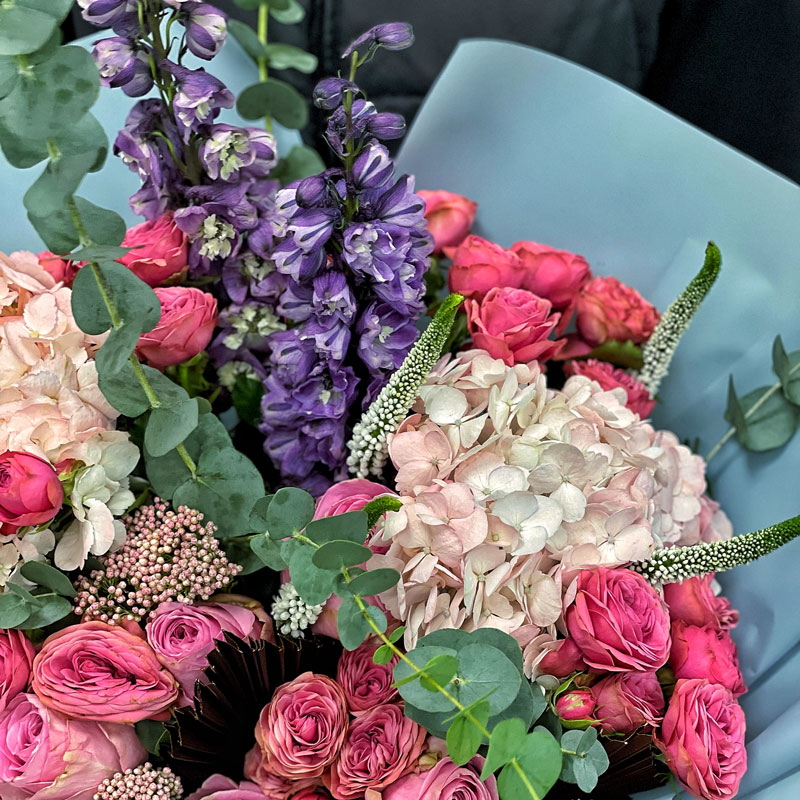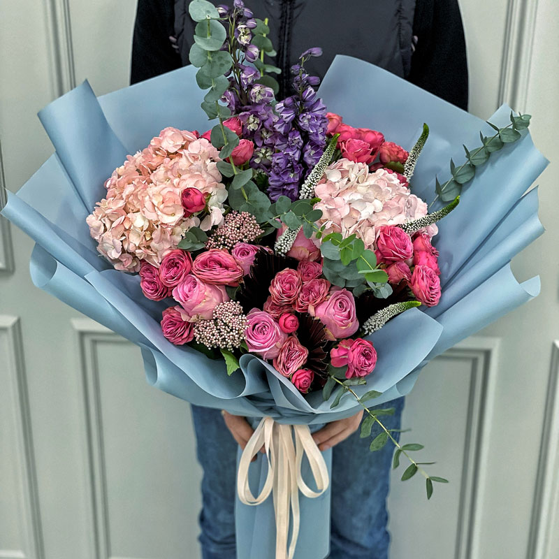 Авторський букет з екзотики «Магу» — це поєднання витонченості, розкоші та сучасного дизайну. Композиція включає гортензію, піоноподібні троянди Марвелоу Баблз, дельфініум, озотамнус, евкаліпт, сухоцвіти та декоративну вероніку, що робить букет надзвичайно стильним та гармонійним. Насичені кольори червоного, рожевого, фіолетового й пастельного створюють незабутнє враження.