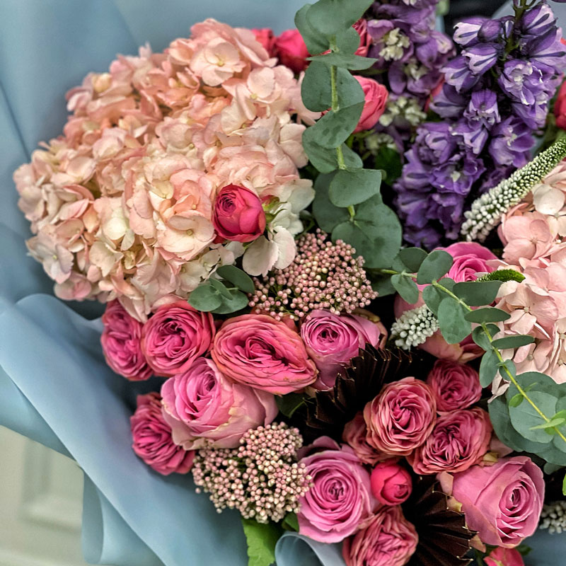 Цей букет — ідеальний вибір для особливих моментів, таких як день народження, ювілей, заручини чи професійні досягнення. Екзотичні елементи підкреслюють статус і унікальність композиції, а піоноподібні троянди додають романтичності. Гортензія символізує гармонію й щирість, тоді як евкаліпт дарує свіжість та довершеність.