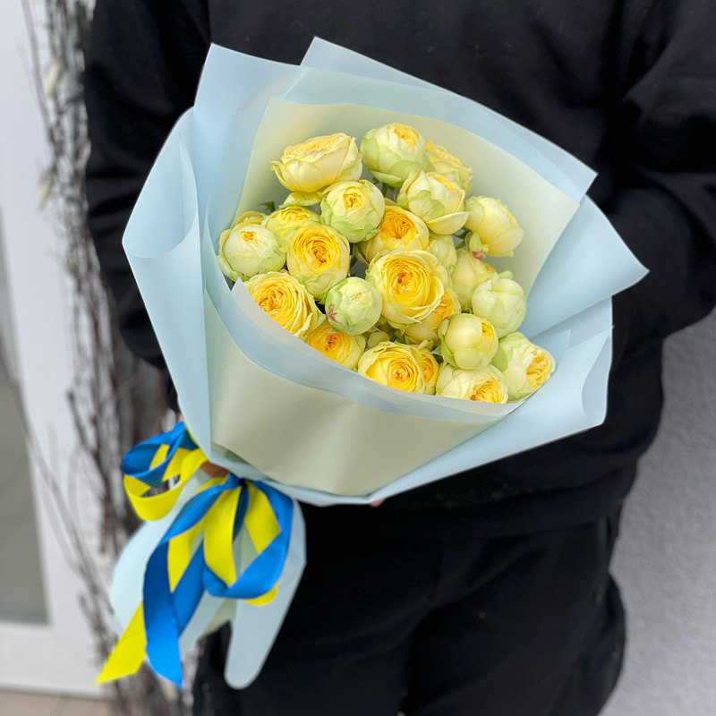 Дизайн букета доповнюється стрічкою у жовто-блакитних тонах, яка додає композиції патріотичного звучання, і робить його ідеальним вибором для знакових подій, таких як День Незалежності, привітання колег або друзів із професійними досягненнями, або просто теплий жест підтримки та вдячності.