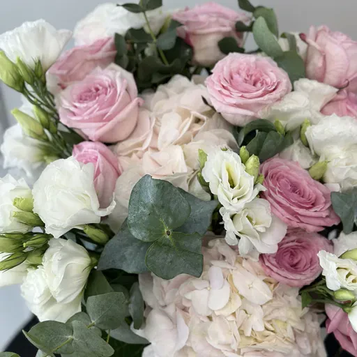 Цей букет гармонійно поєднує ніжно-рожеві та кремові відтінки, що робить його універсальним і водночас вишуканим подарунком. Оформлений у природному стилі, він підкреслює справжню красу квітів та увагу до деталей.