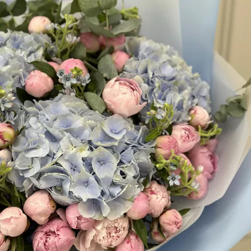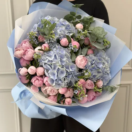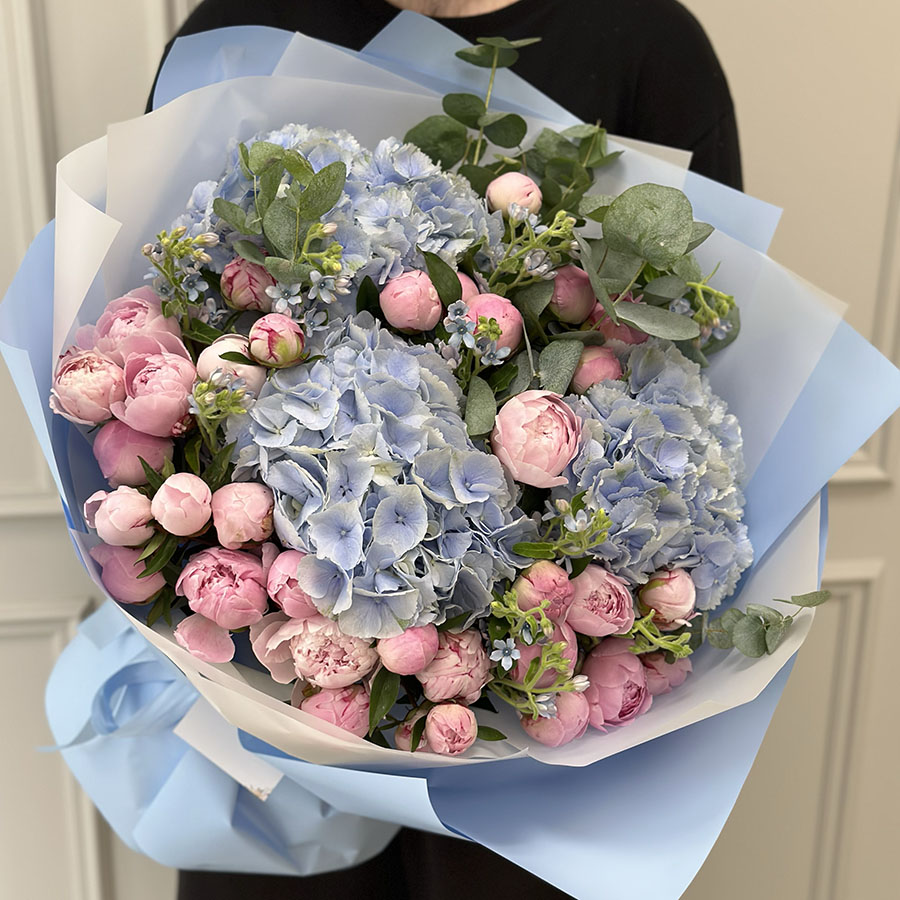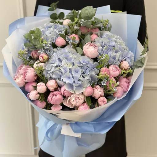 Авторський букет з півонією, гортензією та евкаліптом — це витончений вибір для найвишуканіших моментів. Розкішні голландські рожеві півонії, тендітна блакитна гортензія та свіжість евкаліпта створюють гармонійне поєднання, яке ідеально підійде для весіль, ювілеїв або романтичних сюрпризів.