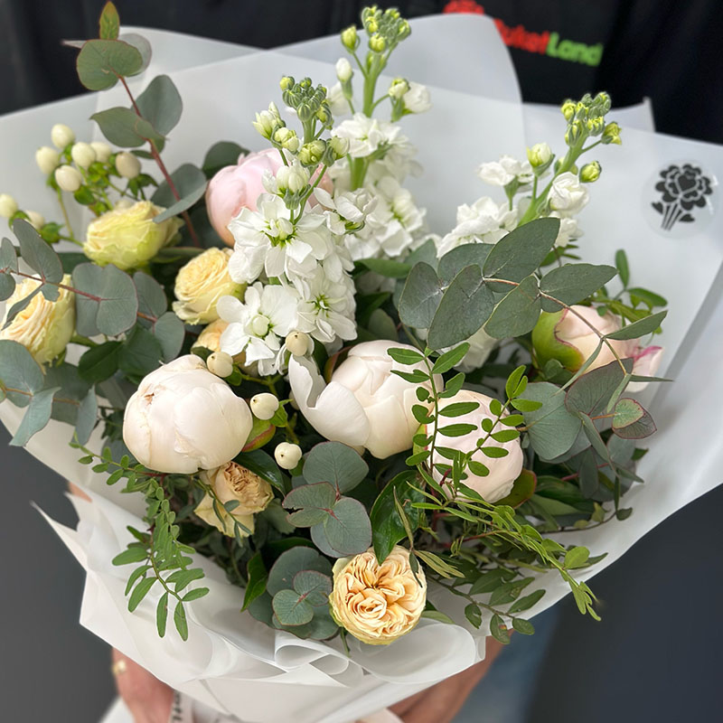 Авторський букет квітів «Evelyn» — це справжня симфонія ніжності та елегантності. Поєднання розкішних півоній у натуральних відтінках, кущових троянд Бомбастик, матіоли, гіперікума та евкаліпта створює витончену композицію, яка підійде як для святкових подій, так і для тих моментів, коли хочеться сказати "Дякую" чи "Я тебе люблю".