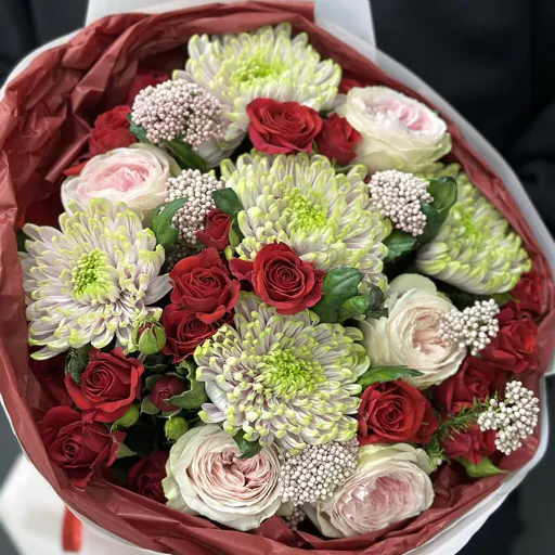 У складі букета: розкішні кущові троянди Velvet Blossoms, півонієподібні троянди з ніжною текстурою пелюсток, хризантеми у м'якому зеленому відтінку, які символізують щастя, та витончений озотамнус для легкого аромату.