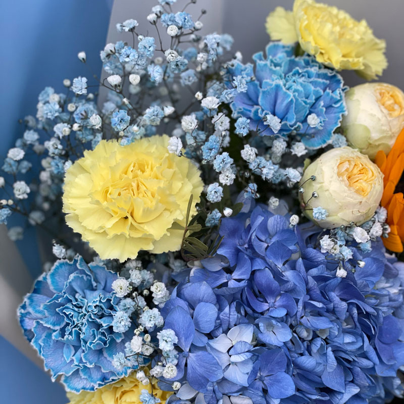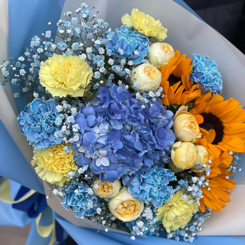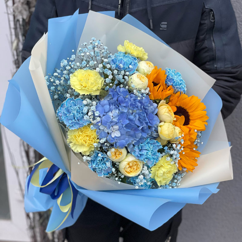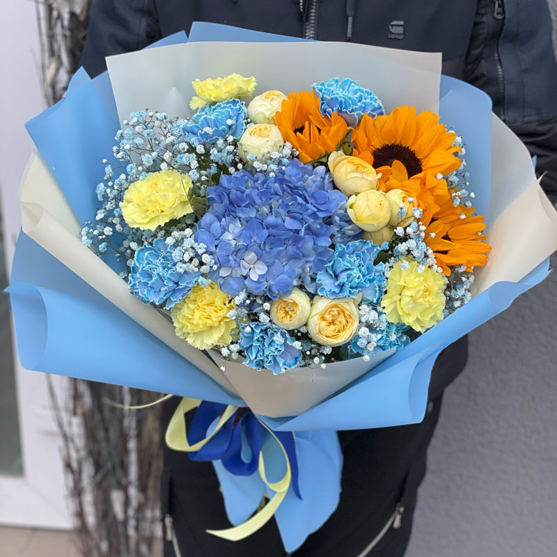 Авторський букет квітів «Home» — це справжня квіткова композиція, яка дарує тепло, затишок і радість. Цей букет ідеально підійде для святкових подій, як то річниця, день народження чи навіть урочисте привітання вдома. Поєднання яскраво-жовтих соняшників, ніжних білих троянд, насичено-синьої гортензії та витончених гвоздик створює гармонію кольорів і настрій, що наповнює позитивом.