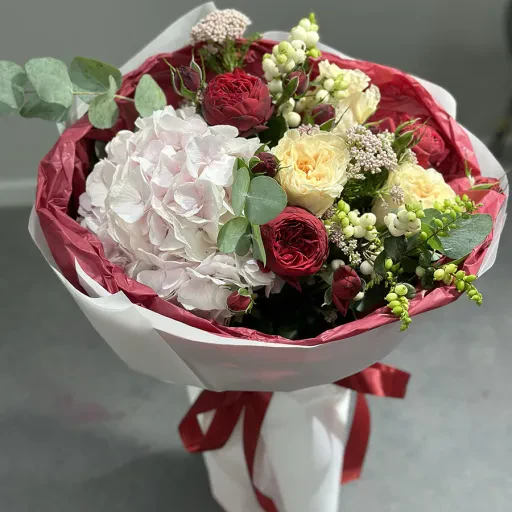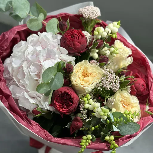Букет "Ivory Flame" — це справжній шедевр флористики, який підкорює своєю гармонією та вишуканістю. У його складі: ніжна гортензія, півоноподібні троянди, благородний осотамнус, евкаліпт та екзотичні елементи, які додають об’єму та характеру. Кожен квітковий акцент ретельно підібраний, щоб створити враження витонченості й легкості.