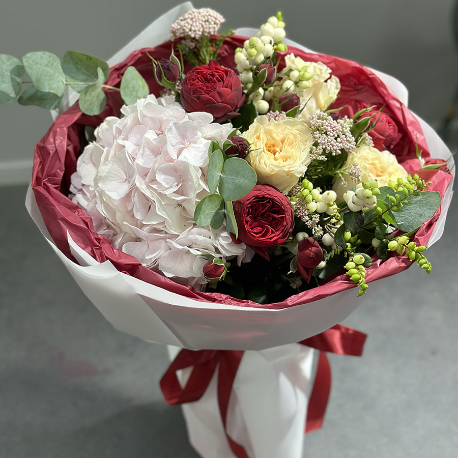 Цей букет ідеально підійде для особливих моментів: привітання на річницю, подяки бізнес-партнеру або навіть як комплімент на романтичному побаченні. Півоноподібні троянди символізують елегантність і щирість почуттів, гортензія — розкіш і граціозність, а евкаліпт додає нотки свіжості.