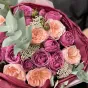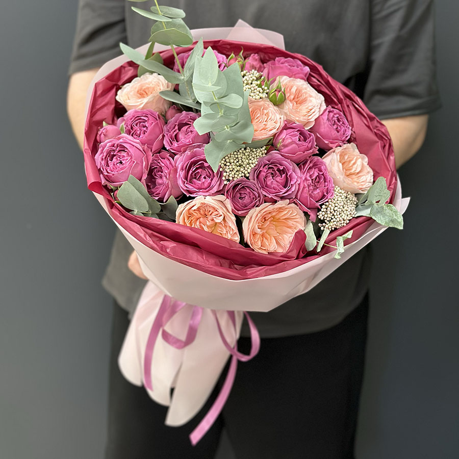 Авторський букет із півонієподібних троянд – це справжнє мистецтво флористики, створене для того, щоб вражати та дарувати емоції. Ніжна гармонія рожевих, персикових та бордових відтінків півонієподібних троянд у поєднанні з кущовими трояндами Misty Bubbles, озотамнусом і витонченим евкаліптом утворюють стильну та вишукану композицію.