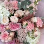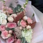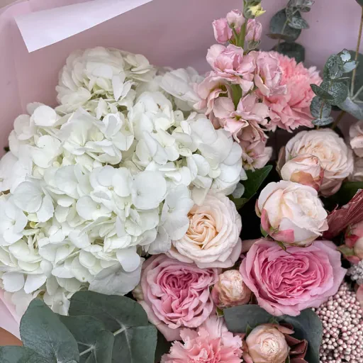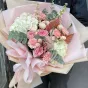 - Розкішний склад. Гортензії додають букету об’ємності, троянди підкреслюють романтичність, а гвоздики — елегантність.