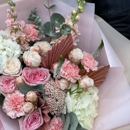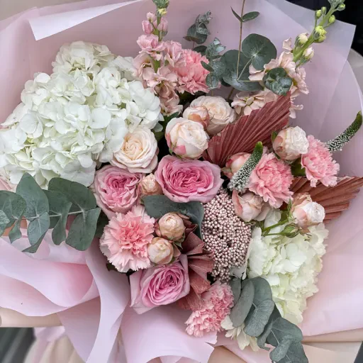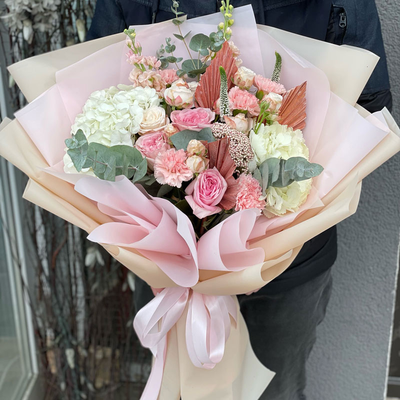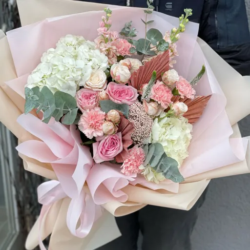 Авторський букет квітів «Lira» — це справжній витвір мистецтва, який втілює витонченість, ніжність і сучасний стиль. У його складі гортензії, що символізують вдячність і розкіш, піоновидні троянди, які асоціюються з романтикою, та чарівні гвоздики (5 шт.), що додають елегантності та символізують відданість. Букет доповнений веронікою, екзотичними елементами, евкаліптом та озотамнусом, які додають йому текстурності та природного шарму.