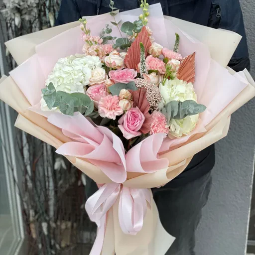 - Елегантне оформлення. Завдяки пастельним кольорам і сучасному дизайну букет підходить як для подарунків, так і для декору.