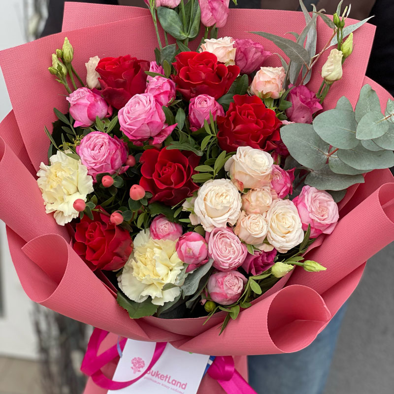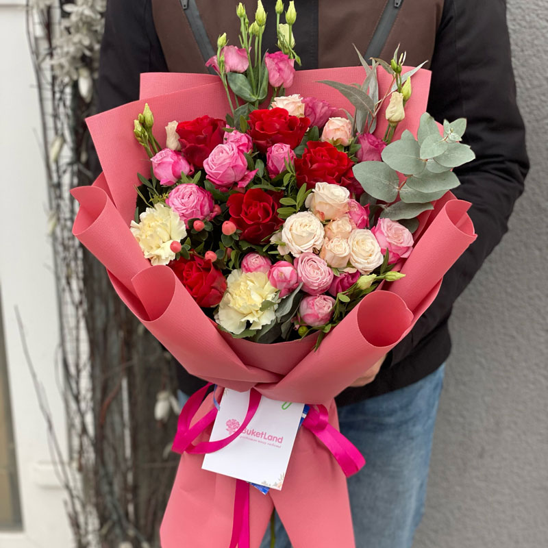 - Різноманіття текстур і кольорів. Червоні троянди символізують пристрасть, спрей-троянди й гвоздики додають ніжності, а еустома та евкаліпт забезпечують легкість композиції.