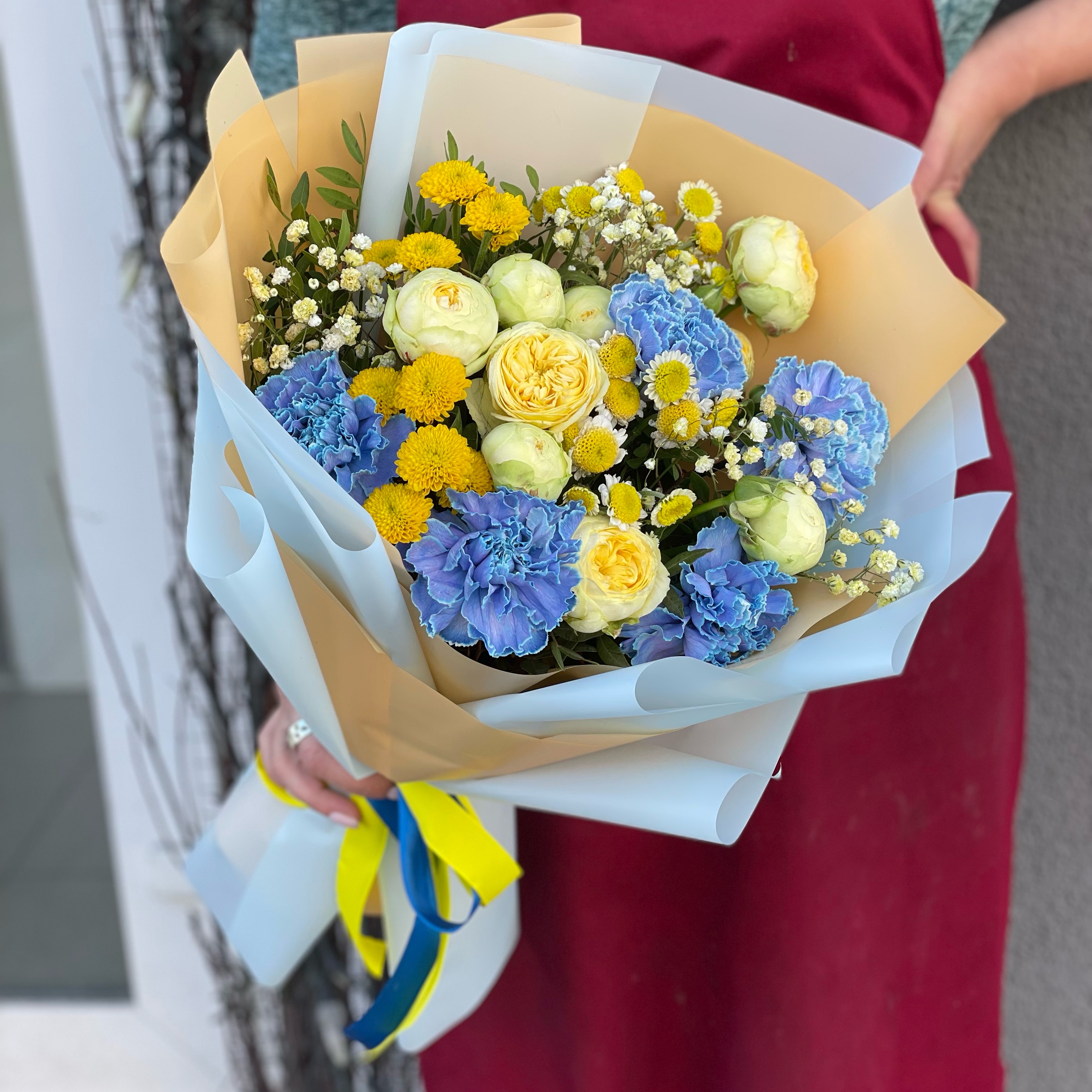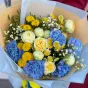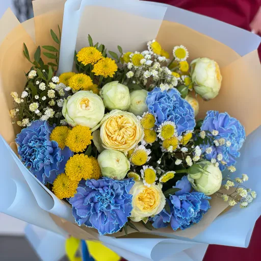 Авторський букет квітів «Незламна» відрізняє дивовижна цілісність, тут складно виділити окрему квітку, кожна з них наголошує на значущості наступної. І різноманітність відтінків цьому не перешкоджає жодною мірою. У композиції переважають білий, жовтий та блакитний відтінки, які акуратно обрамляють зелень та крихітні квіти Гіпсофіли. Чарівність букету надає хризантема, ніжність - кущова троянда Піоні Баблз, а сенс - велика гвоздика.