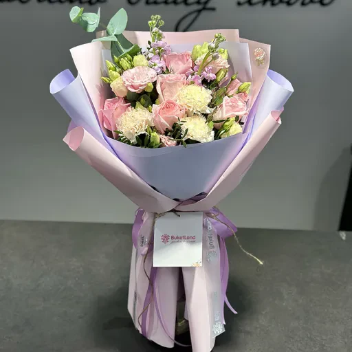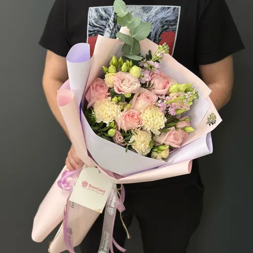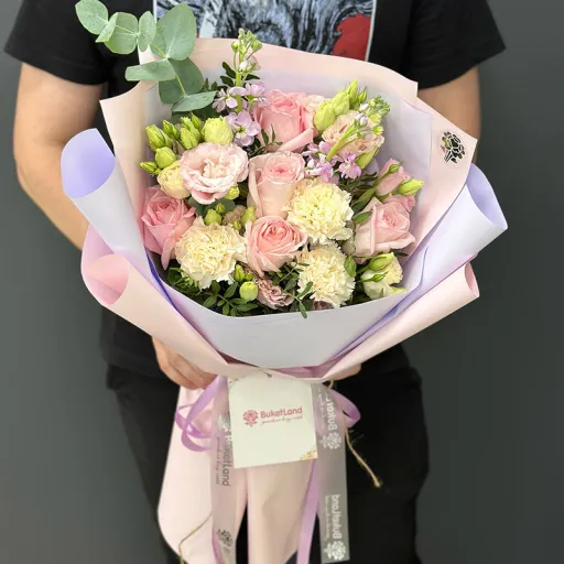 Авторський букет квітів «Polly» — це витончена композиція, створена для того, щоб зробити будь-яку подію незабутньою. У складі букета: гвоздики, матіола, півоноподібні троянди та евкаліпт. Його ніжні рожево-зелені тони створюють відчуття гармонії та тепла.