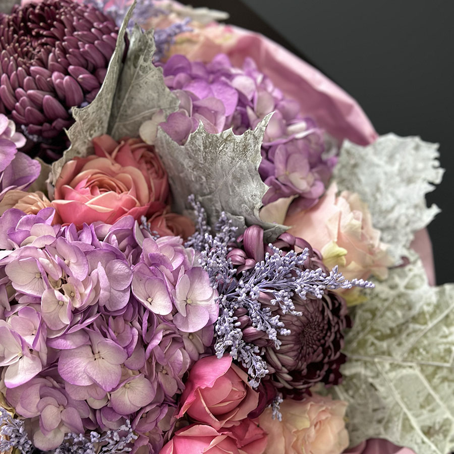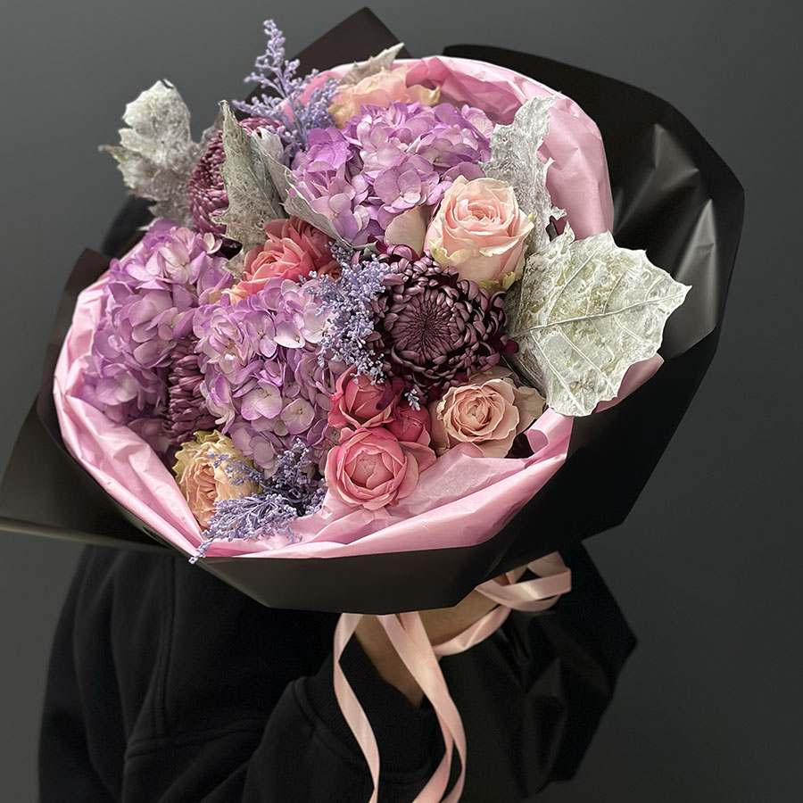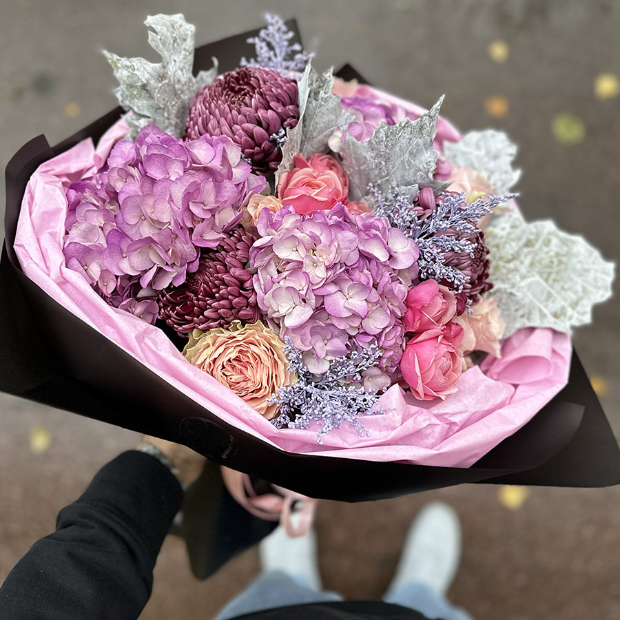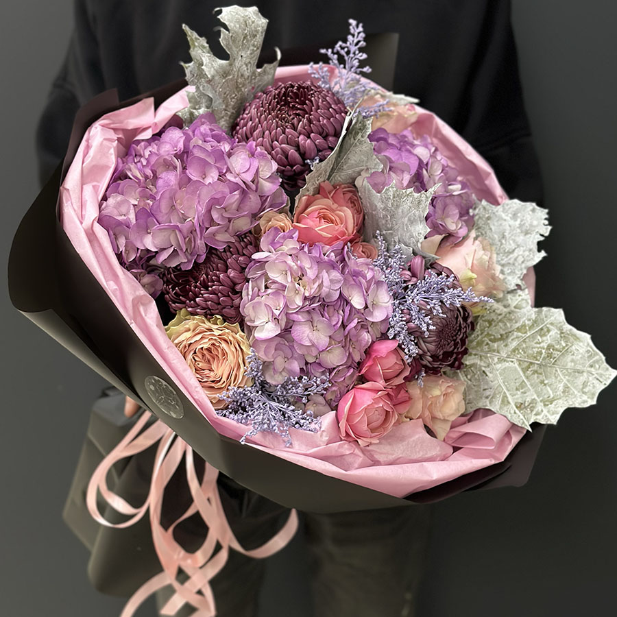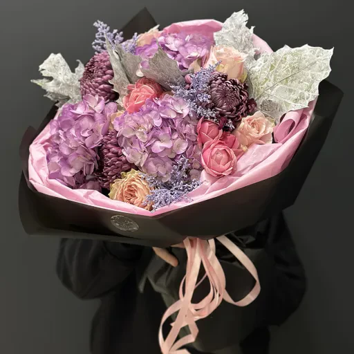 Авторський букет квітів «Purple Symphony» — ідеальний вибір для тих, хто хоче здивувати та порадувати близьких оригінальністю та витонченістю. Цей букет поєднує гортензії, кущові троянди Сільва Пінк, піоноподібні троянди, хризантеми та інші квіти, які створюють елегантну кольорову симфонію. Кожен елемент композиції додає свій неповторний штрих, утворюючи гармонійне поєднання ніжності та розкоші.