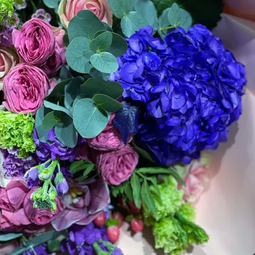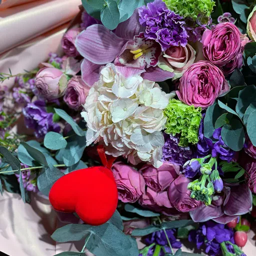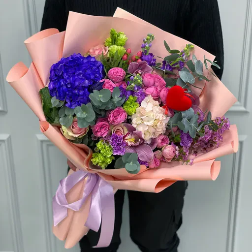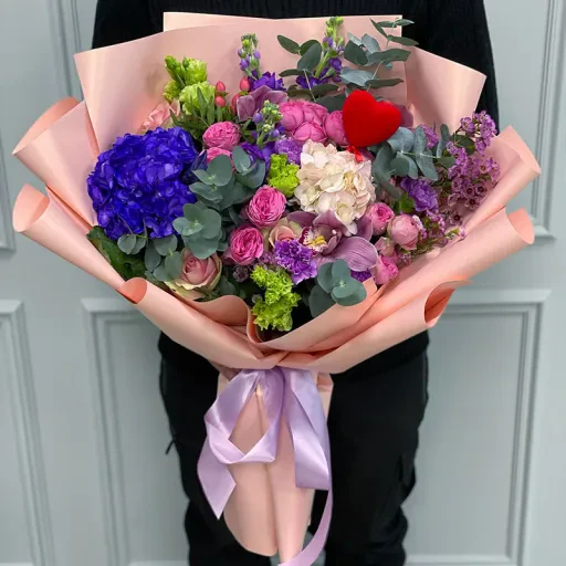Авторський букет квітів «With Love» | розмір XL – це справжнє мистецтво квіткового дизайну, створене для найважливіших моментів вашого життя. У ньому гармонійно поєднуються розкішні рожеві троянди, благородні фіолетові гортензії, ніжні еустоми та декоративна зелень. Така композиція стане ідеальним вибором для освідчення в коханні, ювілею або річниці. Вона створює атмосферу елегантності та щирості.