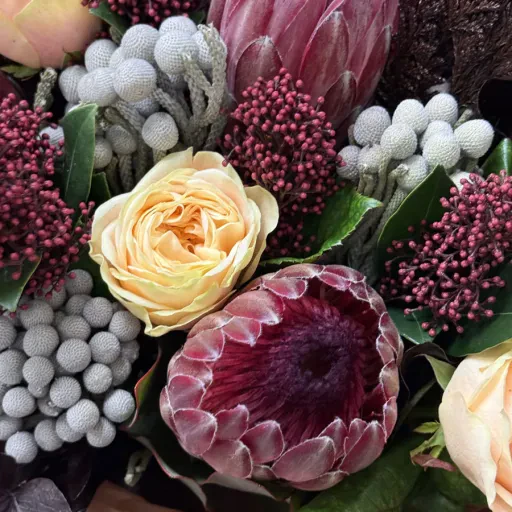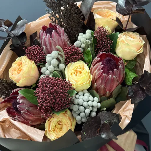 Поєднання екзотичної протеї з елегантними квітами та декоративною зеленню створює незвичайну композицію, яка виглядає сучасно та стильно. Його стильна крафтова упаковка підкреслює кожну деталь, перетворюючи букет на справжній арт-об’єкт.Емоції, які він викликає