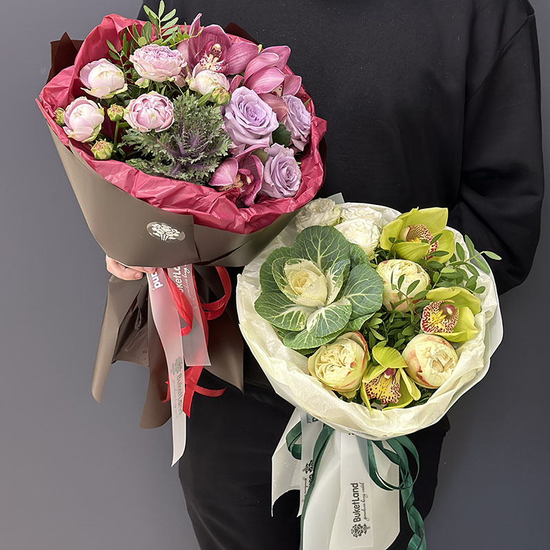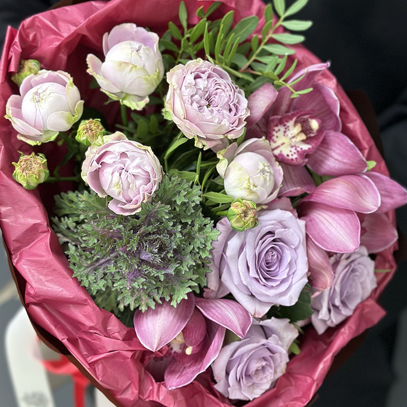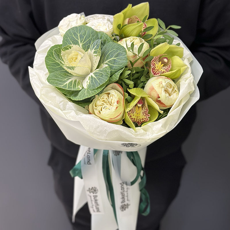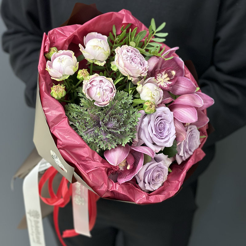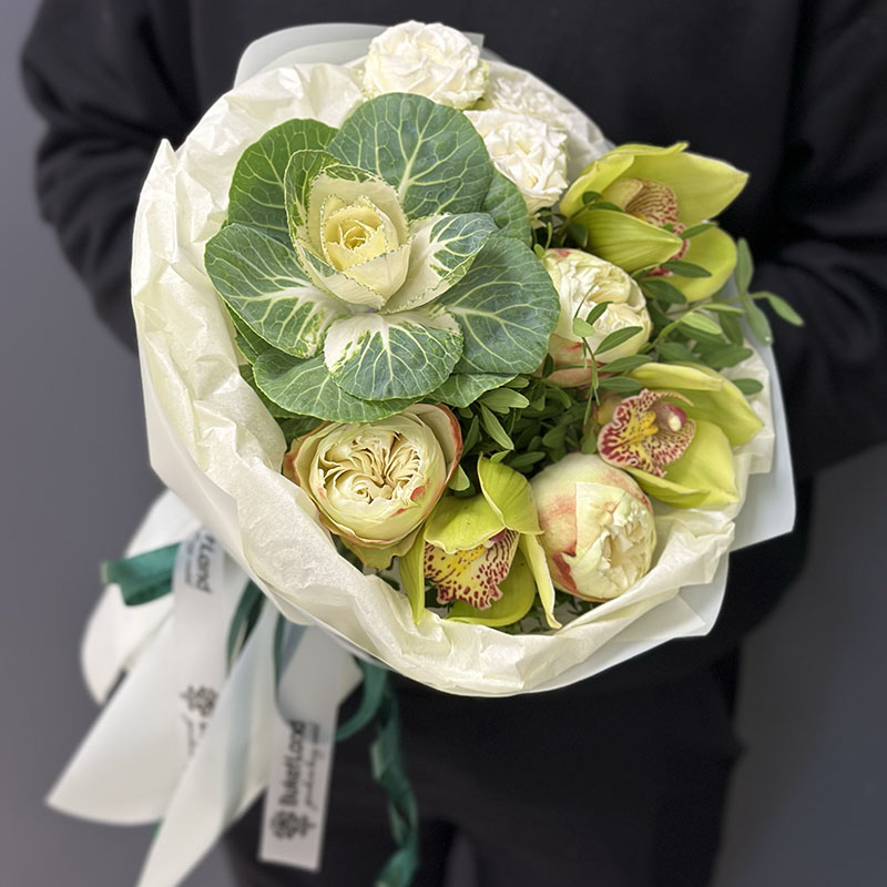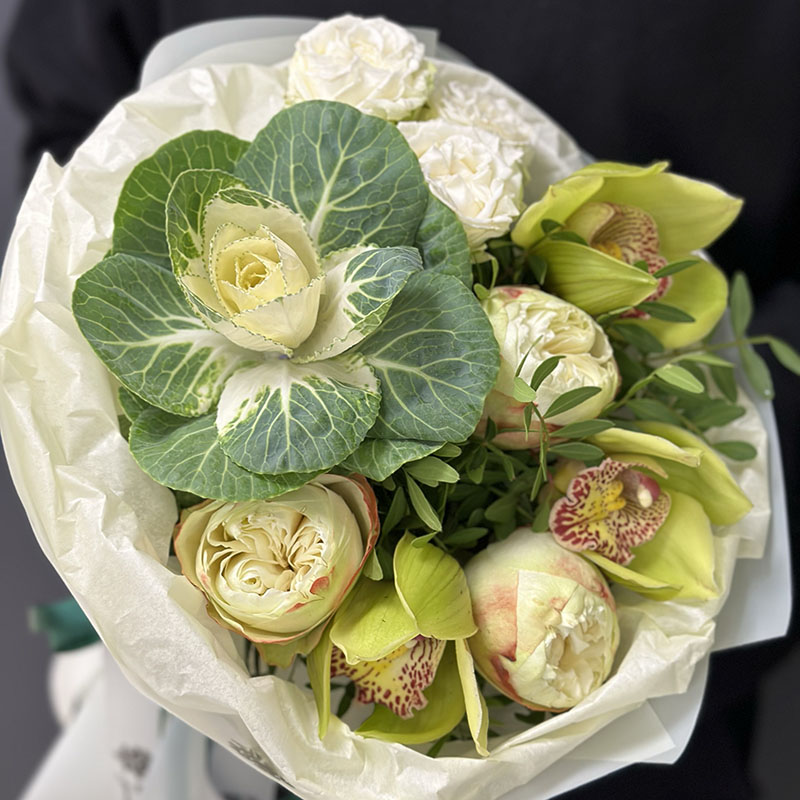 Авторський букет квітів у асортименті «Ivy» — це унікальна композиція для тих, хто хоче справити незабутнє враження. У складі букета гармонійно поєднані піоноподібні троянди Бомбастік, орхідеї Цимбідіум, декоративна капуста (брассіка) та зелень. Такий букет стане чудовим подарунком для колеги, рідних чи навіть для прикрашення інтер'єру.