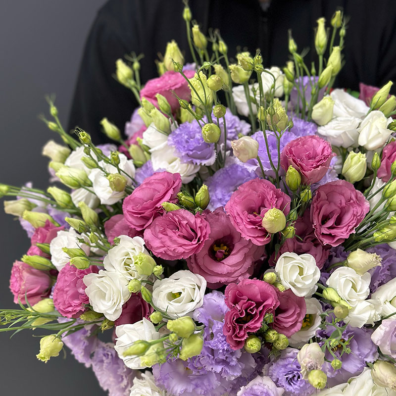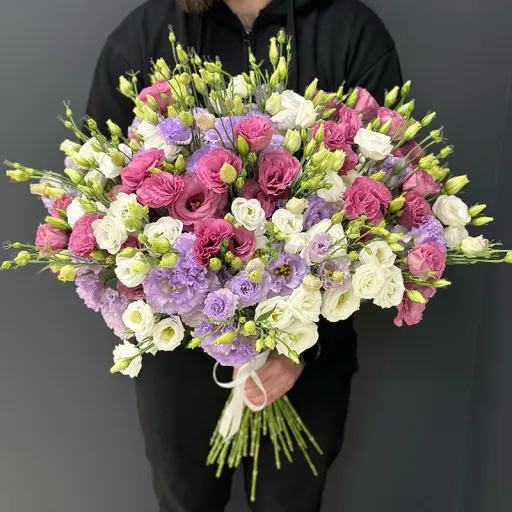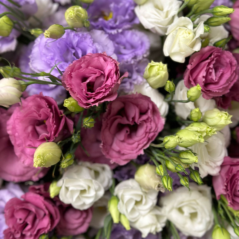 Букет з 51 еустоми мікс — це вишуканий подарунок, який підкорює своєю ніжністю та гармонією. Поєднання різнокольорових квітів — білих, рожевих, фіолетових і кремових еустом — створює розкішну композицію, яка викликає справжнє захоплення. Завдяки природній красі та витонченості, еустома є символом елегантності, щирості та вдячності.