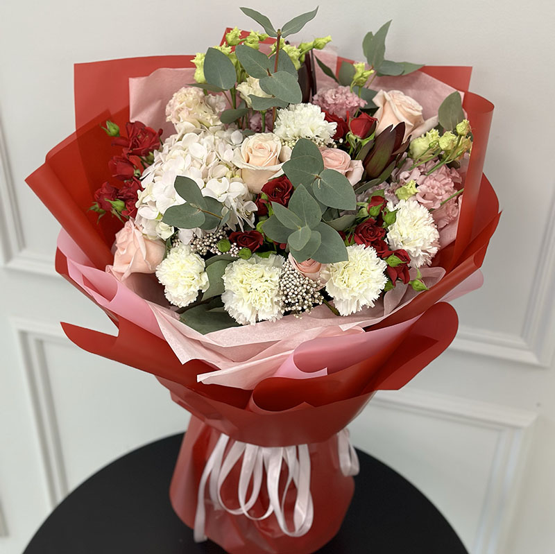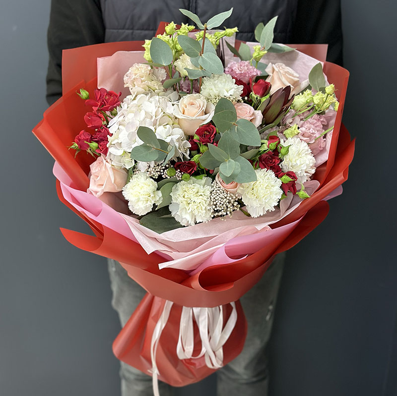 Букет квітів «Amore» – це більше, ніж просто квіти. Це елегантне втілення почуттів, яке ідеально підходить для особливих моментів. Гортензії, гвоздики, троянди Velvet Blossoms та Кімберлі у гармонії з еустомами й евкаліптом створюють композицію, яка вражає своєю ніжністю та стильним дизайном. Осотманус додає легкого контрасту, а червона упаковка підкреслює витонченість букета.