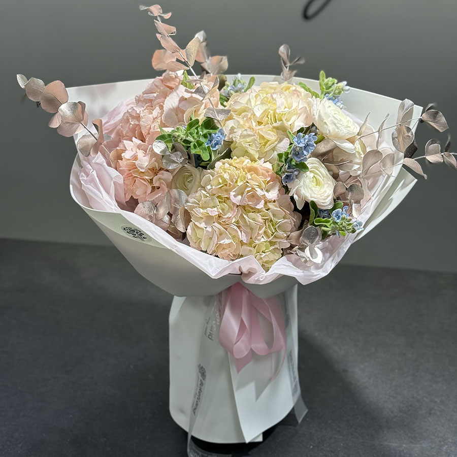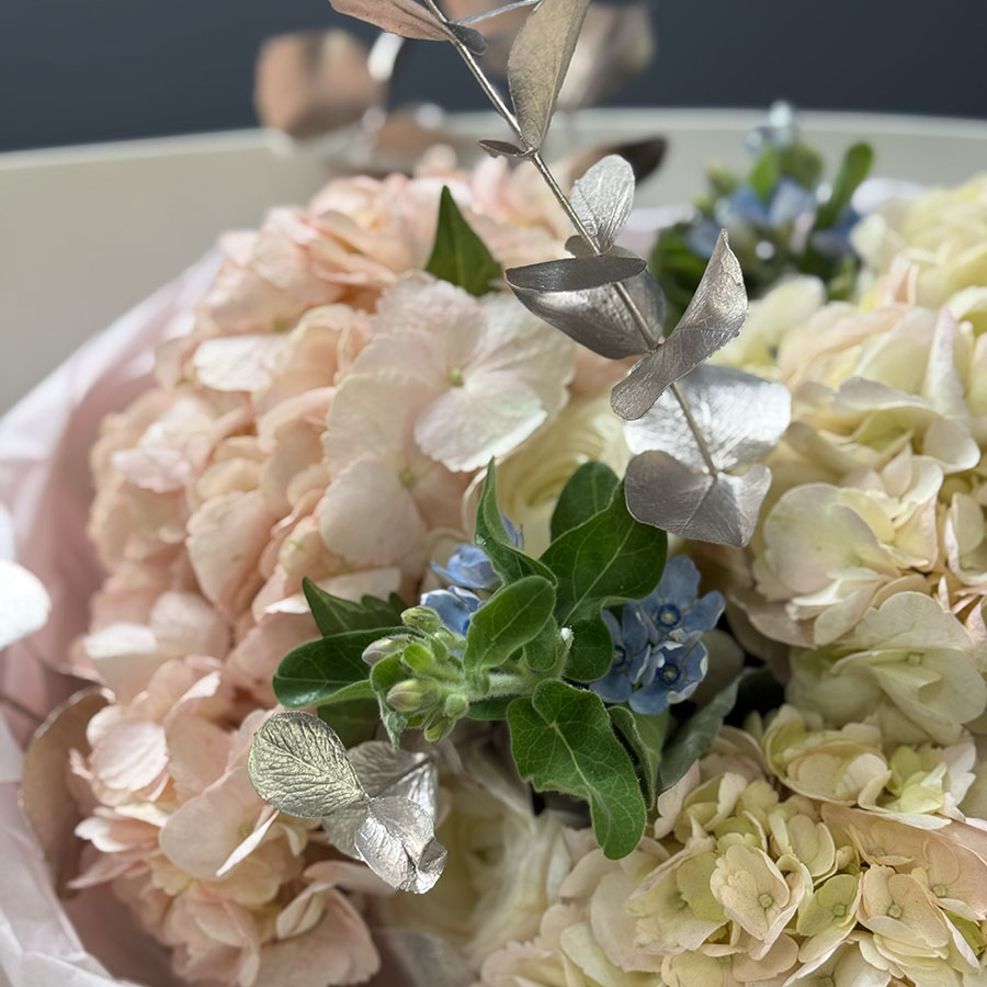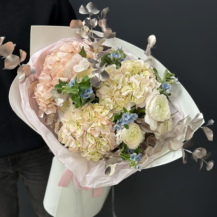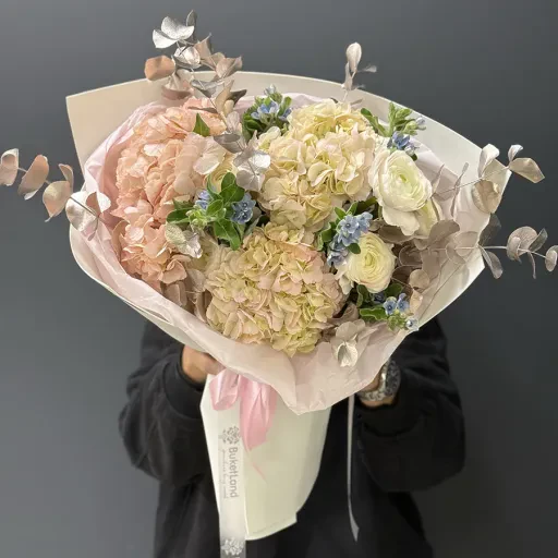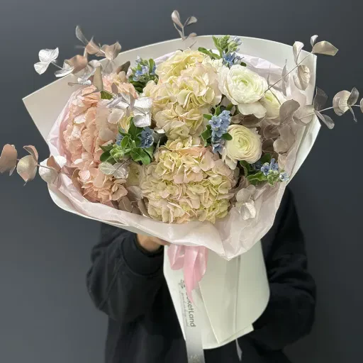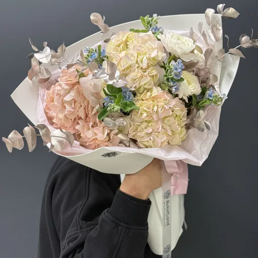 Букет квітів «Fleur» – це справжній витвір мистецтва, що зачаровує своєю ніжністю та гармонією. Головною родзинкою композиції є гортензії, що символізують щирість, глибокі почуття та розкіш. Їх доповнюють елегантні рожеві, кремові та блакитні відтінки, створюючи витончену палітру. Композиція підкреслена декоративною зеленню та стильними стрічками.