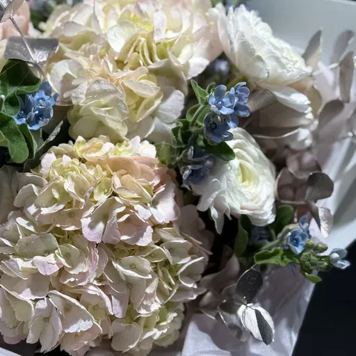 Цей букет ідеально підійде для святкових моментів: ювілеїв, весіль чи романтичних побачень. Гортензії, які є серцем композиції, мають довгий термін свіжості за правильного догляду – достатньо обрізати стебла під кутом та змінювати воду кожні 2-3 дні.