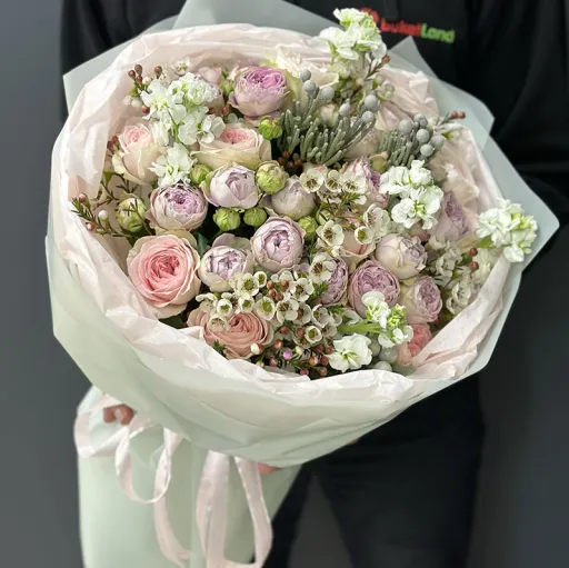 Символіка букета: Кожна квітка у «Garden Grace» має своє значення: піоноподібні троянди символізують романтику, матіола — спокій і вдячність, а хамелаціум додає нотки легкості та магії.