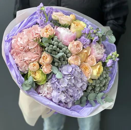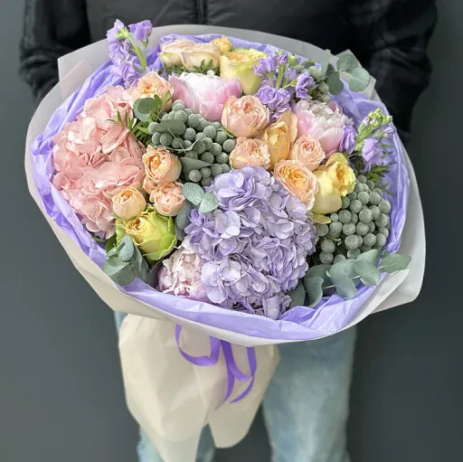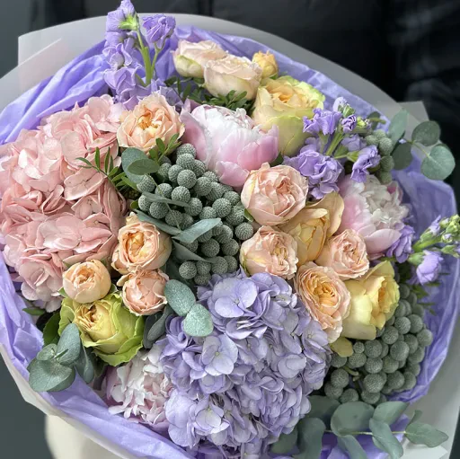 Букет квітів «Gelato» — це ніжність і гармонія, натхненні м’якими пастельними відтінками. У його складі розкішні гортензії, півоноподібні троянди, півонії, стильна брунія, матиола та інші квіткові акценти, що додають композиції об’єму і динаміки. Кожен елемент букета ретельно підібраний, щоб створити відчуття легкості та витонченості, яке ідеально підходить для подарунків на весілля, річницю чи як знак вдячності.