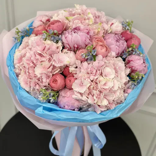 Букет квітів «Hermosa» – це справжній шедевр флористики, створений для тих, хто цінує елегантність і ніжність. Цей розкішний букет поєднує в собі витонченість рожевих півоній, кущових піоноподібних троянд Silver Pink, гортензій та делікатних оксипеталумів. Кожна квітка ретельно відібрана, щоб створити гармонійне поєднання кольорів і текстур.