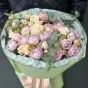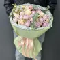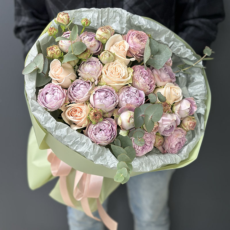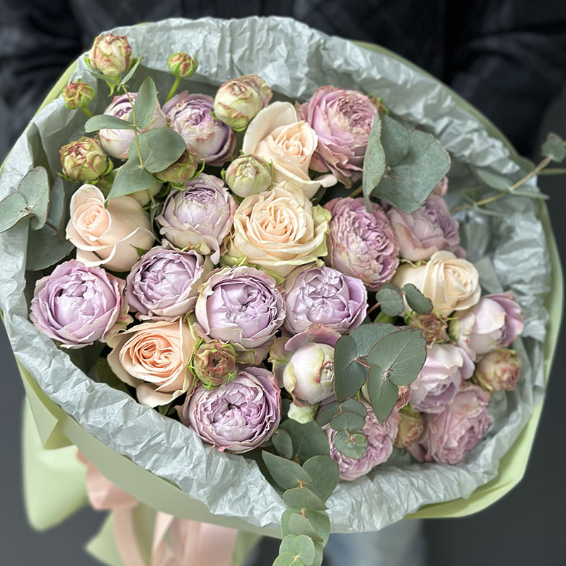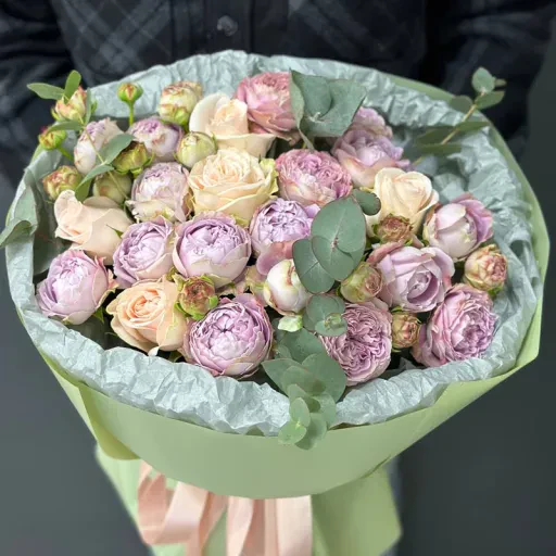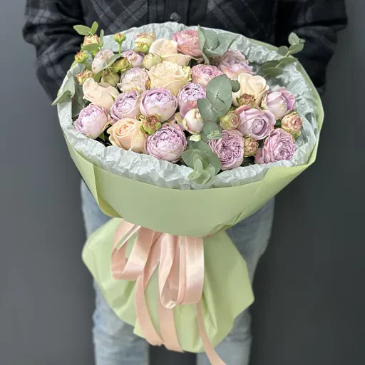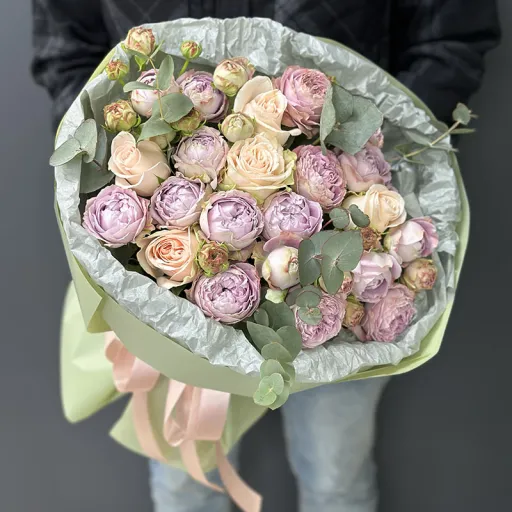 Букет квітів «Lollipop» — це витончене поєднання пастельних відтінків і ніжності. У складі букета кущові півоноподібні троянди сорту Блоссом Баблз і Піоноподібна троянда створюють відчуття легкості та вишуканості. Листя евкаліпта додає природного акценту та гармонійно доповнює композицію.