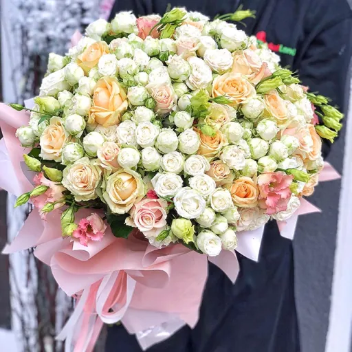 Букет квітів «Хмара щастя» – це справжня казка у квітах. Елегантна композиція з кремових троянд, ніжної еустоми та кущових піоноподібних троянд Бомбастік вражає своєю гармонійністю та стилем. Його вишуканий вигляд робить букет універсальним подарунком для найрізноманітніших подій.