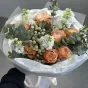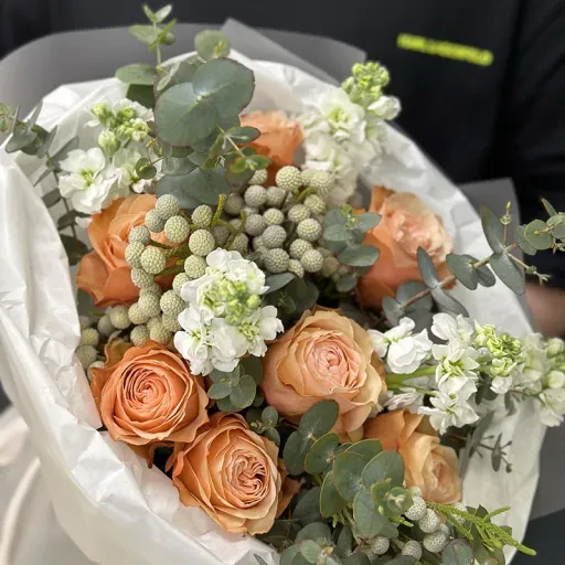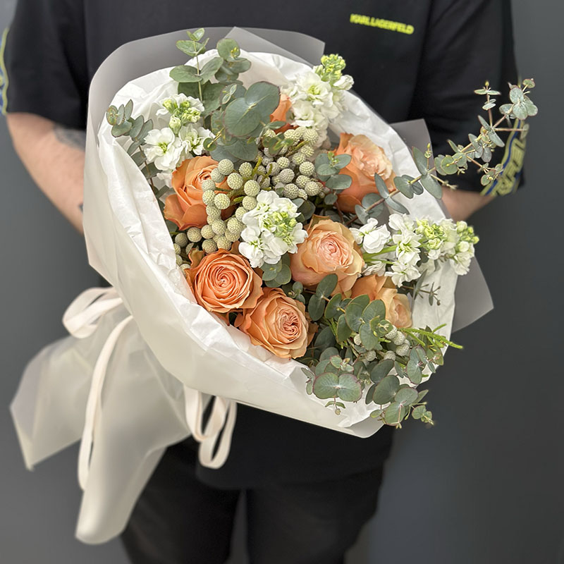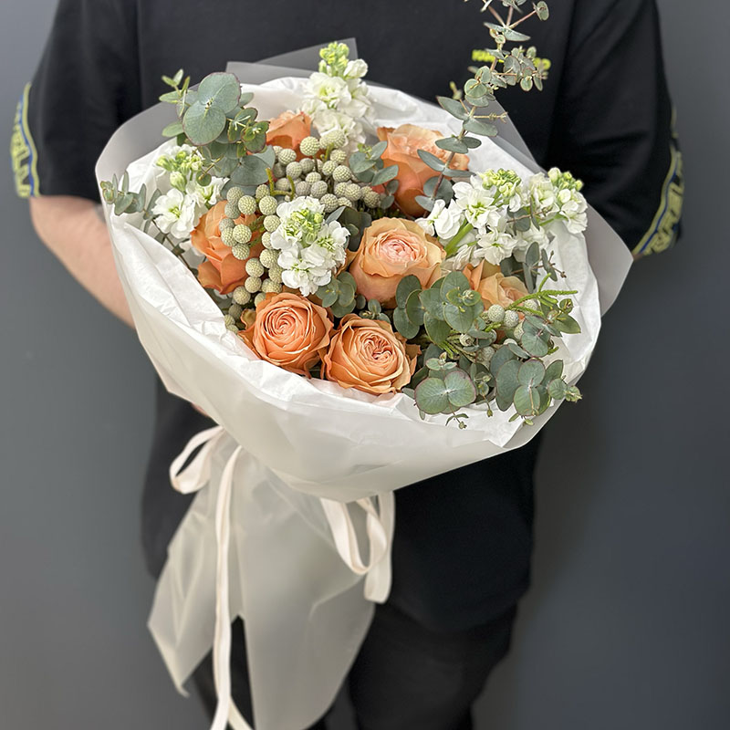Букет квітів «Oblivion» – це поєднання ніжності та витонченості, яке стане ідеальним подарунком для будь-якої важливої події. У складі букета гармонійно поєднуються розкішні персикові троянди, свіжі евкаліптові гілки, делікатні брунії та білосніжні квіти, які символізують чистоту і ніжність. Така композиція підійде для привітання з річницею, днем народження чи навіть для освідчення.