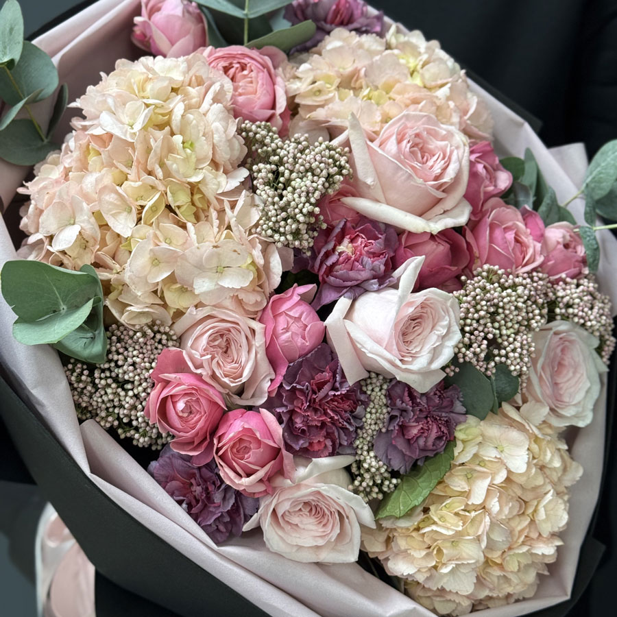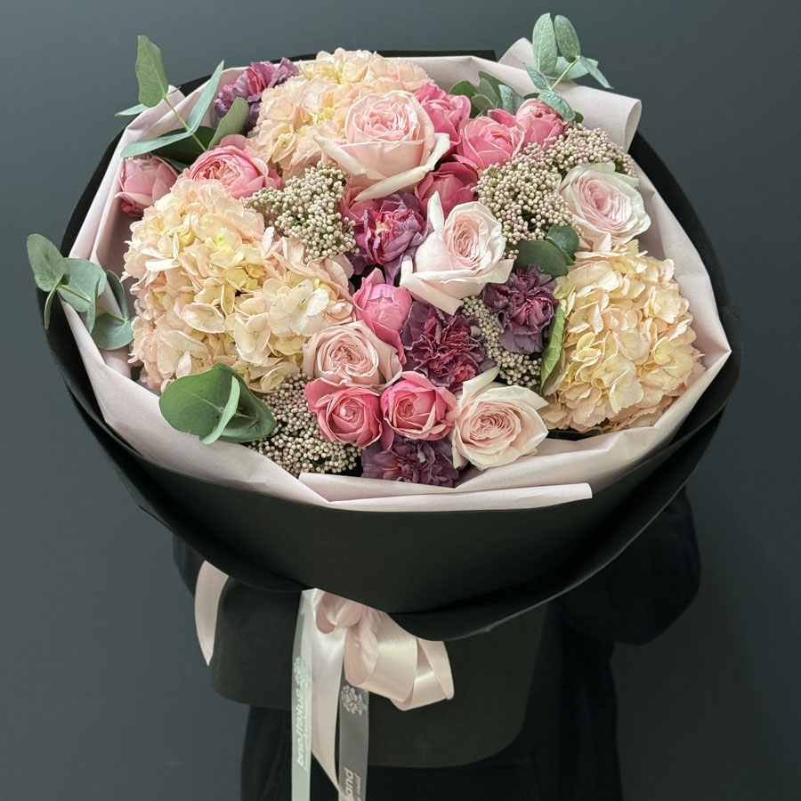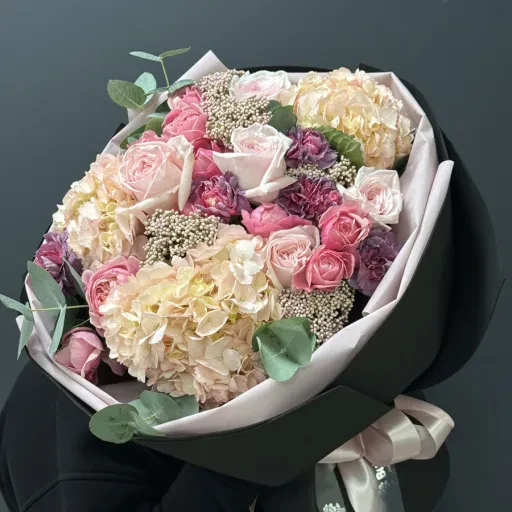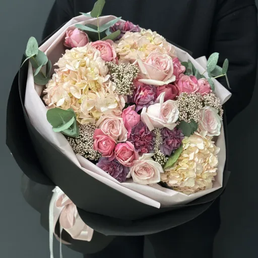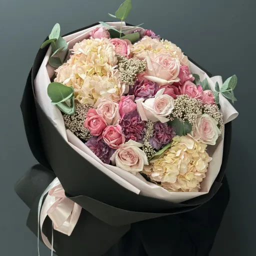 Букет "Roseate" — це витонченість і шарм, втілені в розкішній композиції з гортензій, рожевих троянд, озотамнуса та декоративної зелені. Ця ніжна квіткова композиція стане ідеальним вибором для особливих моментів, таких як день народження, ювілей або романтичне побачення. Завдяки елегантному оформленню в чорному папері, букет виглядає сучасно і стильно.