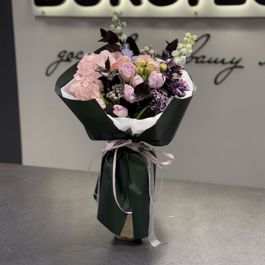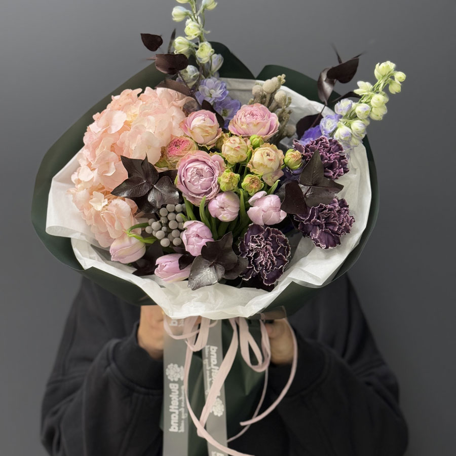 Букет квітів «Shadow» — це невимовна комбінація розкішних та делікатних квітів, що створюють атмосферу глибоких почуттів. Дельфініум додає свіжості, гортензія підкреслює витонченість, а тюльпани додають натхнення та тепла. Доповнюєть композицію сучасний евкаліпт та брунія.
