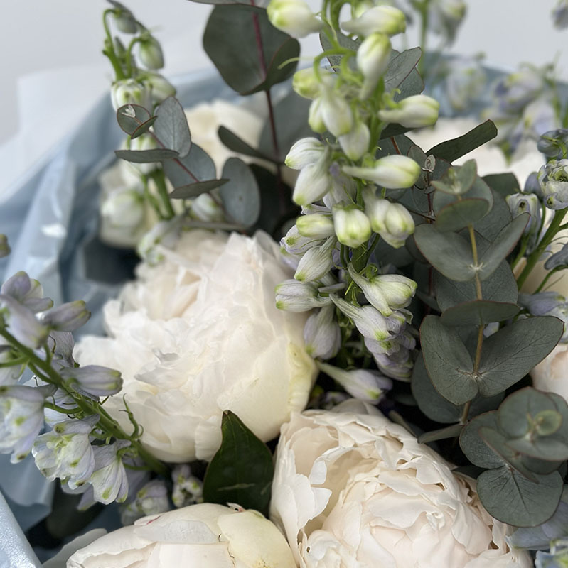 Букет квітів «Sorpresa» — це витонченість і легкість в одній композиції. Створений із голландських білих півоній, дельфініуму та евкаліпта, цей букет ідеально підійде для важливих подій або просто як подарунок для вираження щирих почуттів. Ніжний білий колір квітів символізує чистоту, а додавання евкаліпта надає свіжості та сучасного вигляду.